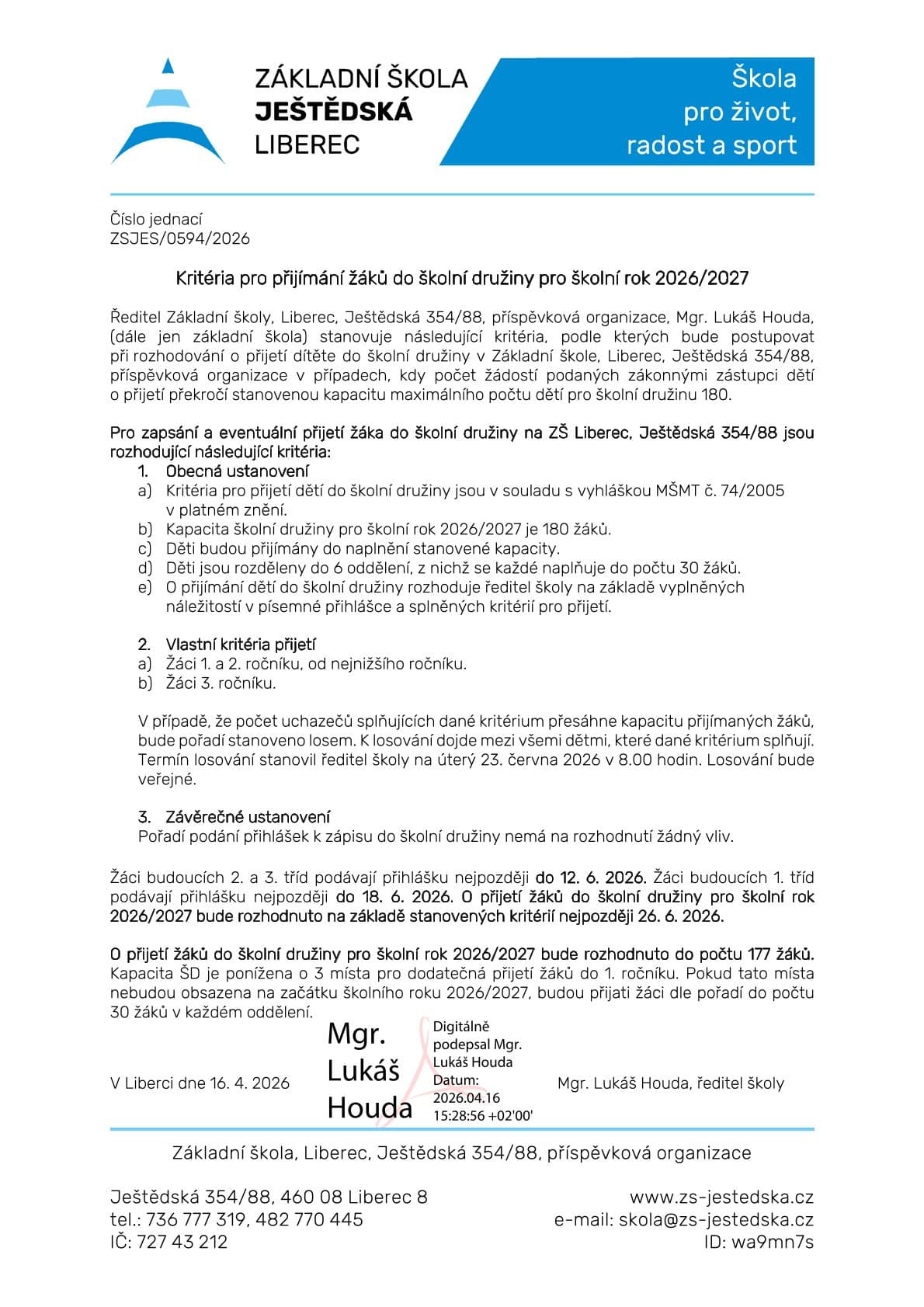 Kritéria pro přijímání, postup přihlašování žáků a výsledky o přijetí do školní družiny (pod registračními čísly) budou zveřejněny na webových stránkách školy, ve vývěsce u hlavního vchodu školy a u vstupu do ŠD.